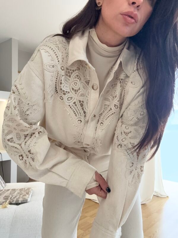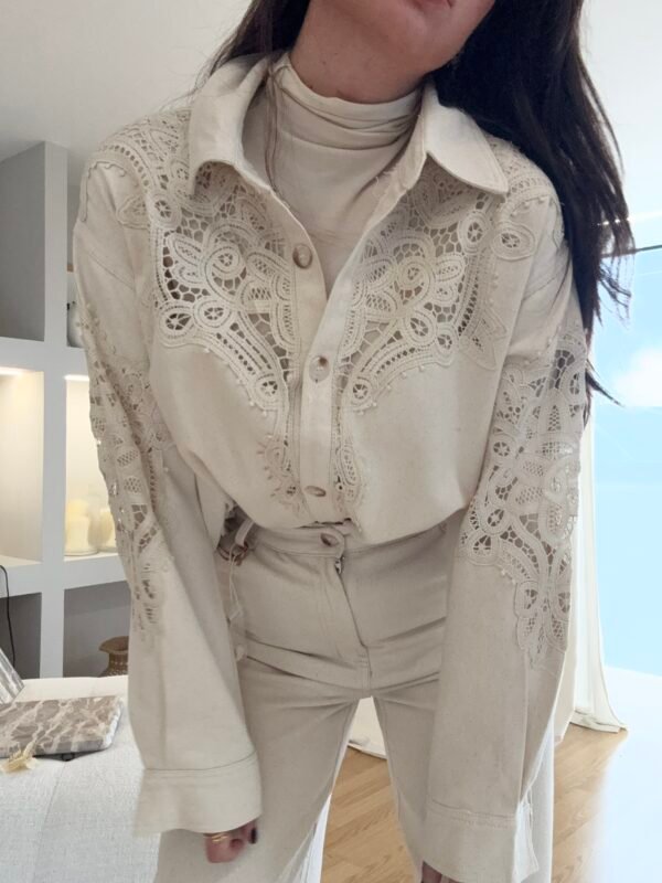 - Elegant ivory shirt with intricate lace appliqué detailing