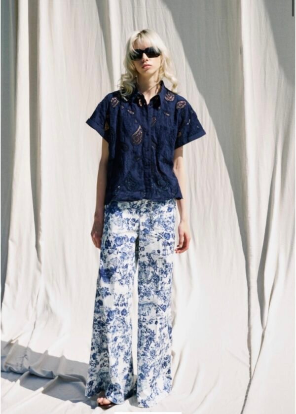 - Elegant wide-leg trousers featuring a refined toile de Jouy-inspired print