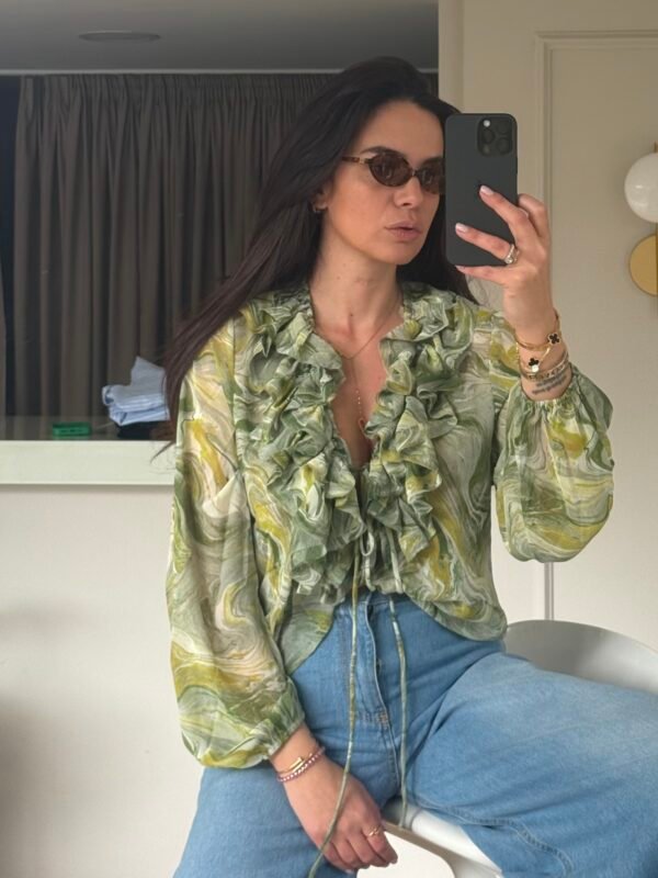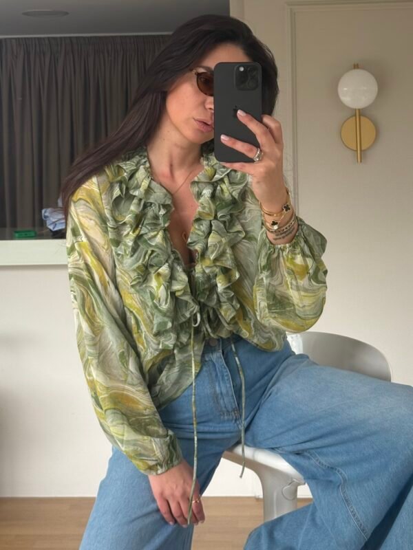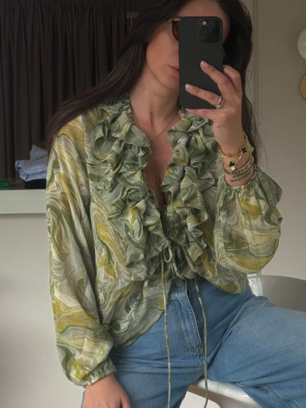 Lightweight blouse with artistic marble-effect print - Soft ruffle detailing framing the deep V-neckline