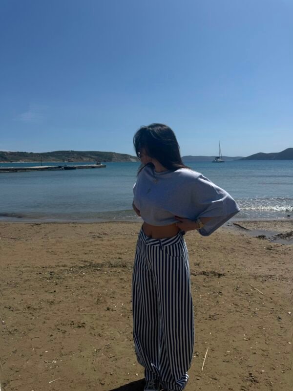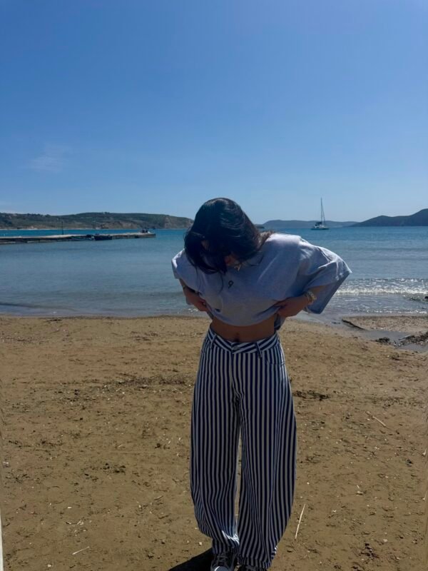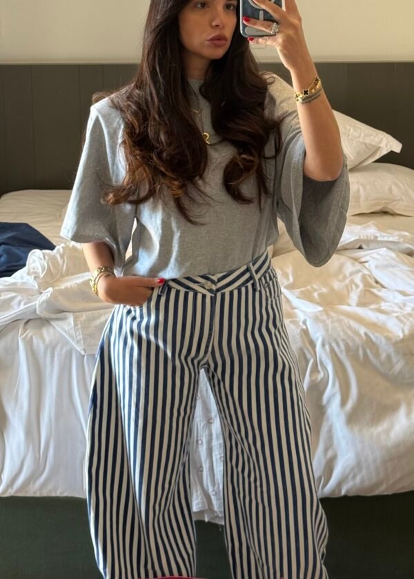 High-waisted wide leg denim with vertical stripe pattern - Blue & white nautical-inspired design